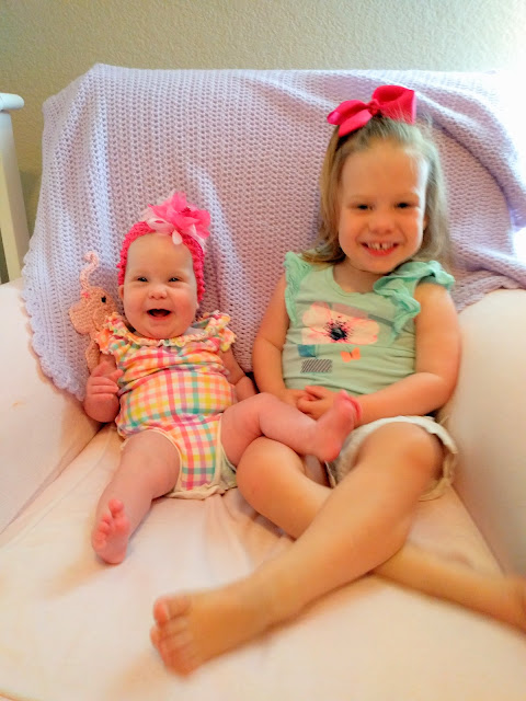 Sleep: This girl is just like her big sister and fighting naps like crazy. I know she needs to be on 3 naps; I just can't figure out when those 3 naps should happen. Plus, most mornings when she should be napping, we're out running errands, so nap 1 is usually just car naps on the go. So far her afternoon nap is her really good, long nap and usually goes from about 1:30-4. I LOVE this naptime because Audrey goes down for a nap/quiet time from 2:00-3:30, so their naps coincide and I can get some stuff done (or choose to get nothing done and rest myself). She's usually in bed right at, or a little after 7pm and has been consistenly sleeping through the night for the last 2 months!! She is a bit of an early bird, and I generally hear her wake up around 6:30 or 6:45. Sometimes, she'll sleep in until 7:15 (you know you're a mom when 7:15 is "sleeping in"!).